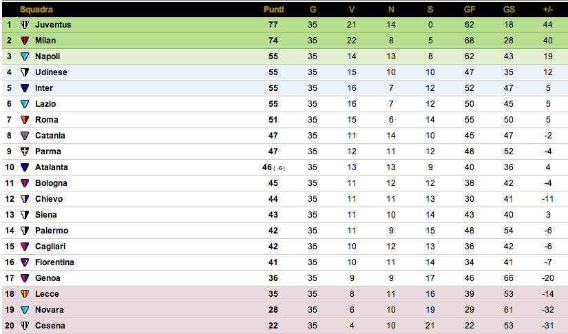 Il campionato di Serie A va verso la conclusione: sono tre le partite ancora da disputare. La Juventus viaggia vero il Sogno e potrebbe essere arbitro anche della sfida per non retrocedere. Nelle ultime due partite ha vinto contro Cesena e Novara, la prima matematicamente in Serie B, la seconda appesa a un misero punto che matematicamente ancora non la condanna, ma che di fatto rende impossibile una rimonta. Nelle ultime tre gare i Bianconeri si troveranno ancora di fronte squadre alla ricerca di punti salvezza e sappiamo bene come queste gare siano complicate. Mercoledì arriva a Torino il Lecce, che lotta con il Genoa per rimanere in Serie A. Domenica sarà la volta della trasferta contro il Cagliari, giocata a Treviso per l’impraticabilità dello stadio dei rossoblu. E, infine, il 13 Maggio arriva a Torino l’Atalanta.