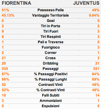 La Juventus porta a casa un pareggio tutto sommato buon. Un risultato che forse sta addirittura largo alla formazione ospite che troppo subisce i padroni di casa. Per la prima volta la squadra di Conte non riesce ad imporre il proprio gioco, il proprio ritmo. Le cause sono certamente una stanchezza collettiva dopo tutte queste partite ravvicinate, ma anche stanchezza dei singoli. Pirlo è sembrato ancora stanco offrendo una prestazione davvero opaca, fino ad essere sostituito dal giovane Pogba. Anche Giovinco non ha inciso nel match, così come il resto della manovra di attacco. Una Fiorentina schierata da Montella in modo perfetto e bisogna darne merito. Fortunatamente i viola non trovano il gol, dapprima grazie alla traversa che salva il colpo di testa di Jovetic, poi è la scarsa precisione degli attaccanti a salvare Buffon.