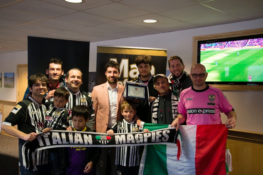 After the game the Italian Magpies returned to Wheelers suite to present the award “Italian Magpie player of the year” to Alan Sheehan. They had a individual photos and a group one too. After the presentation the Italian Magpies and I returned to the hotel to collect Stefano’s, Gabriele’s and Daniele’s luggage as they had a taxi booked from my house back to the airport. Waiting at my home were many Notts County friends who they had met over previous visits to Nottingham and Turin where conversations continued about the game over a few drinks into the early hours of the morning.